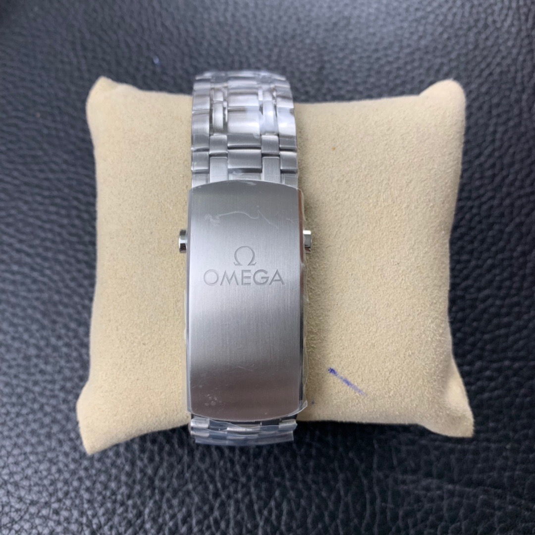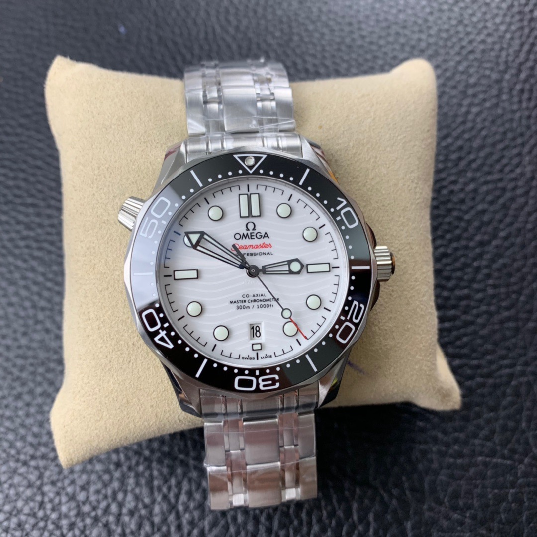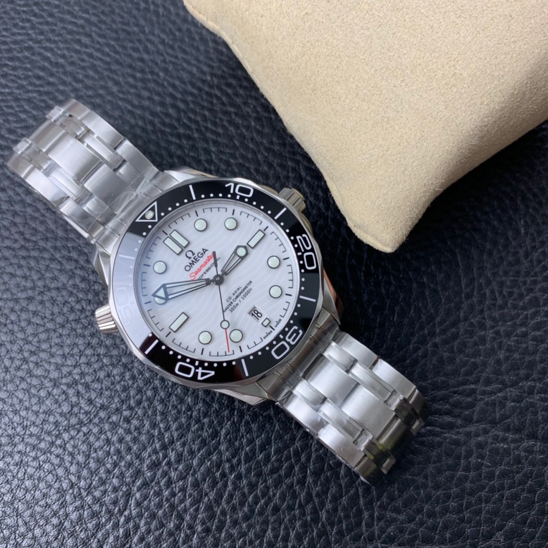 The watch is equipped with a polished and brushed stainless steel bracelet and is powered by the Omega Master Chronometer movement 8800, which is clearly visible through the sapphire crystal glass on the wave-edged case back.