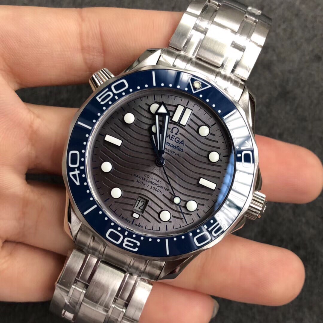This 42 mm model is crafted from stainless steel and includes a blue ceramic bezel with a white enamel diving scale. The dial is sun-brushed PVD chrome colour ceramic and features laser-engraved waves and a date window at 6 o’clock.