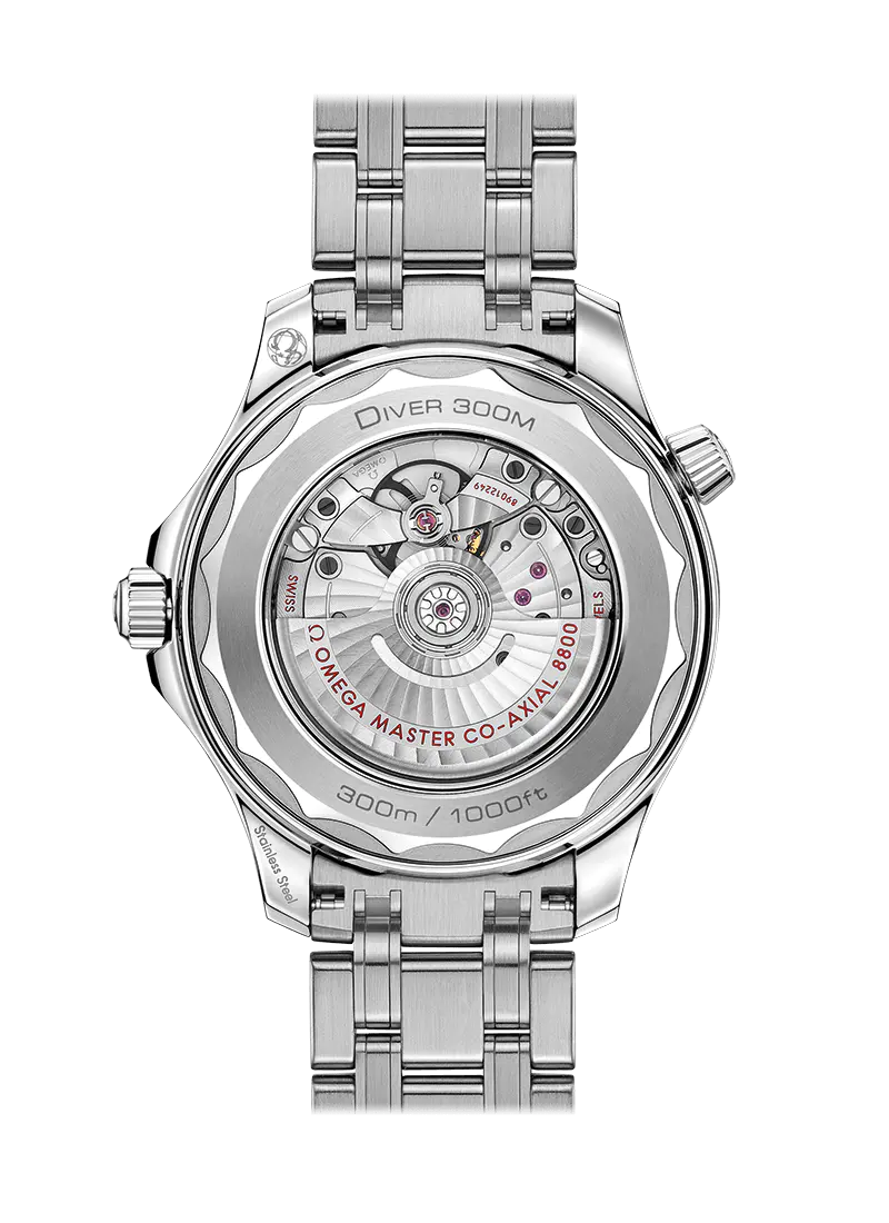 The watch is presented on a stainless steel bracelet and is driven by the OMEGA Master Chronometer Calibre 8800, which can be seen through the sapphire-crystal on the wave-edged caseback.