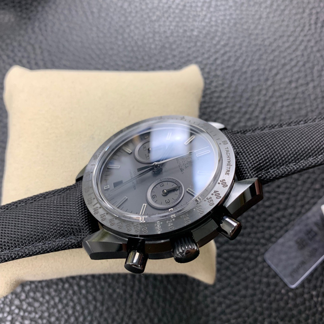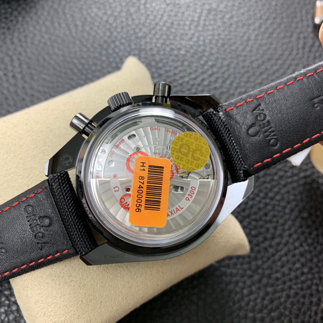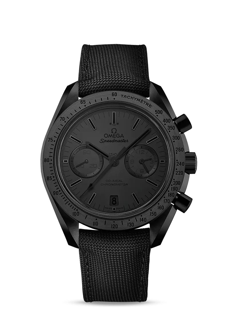 Giving this model its nickname are its brushed blackened Moonwatch-style hands and blackened applied indexes – all of which are coated with black Super-LumiNova. The familiar sub-dials at 3 and 9 o’clock are also matt black and the black ceramic bezel has a black lacquered tachymeter scale. At its heart is the OMEGA Co-Axial calibre 9300.
